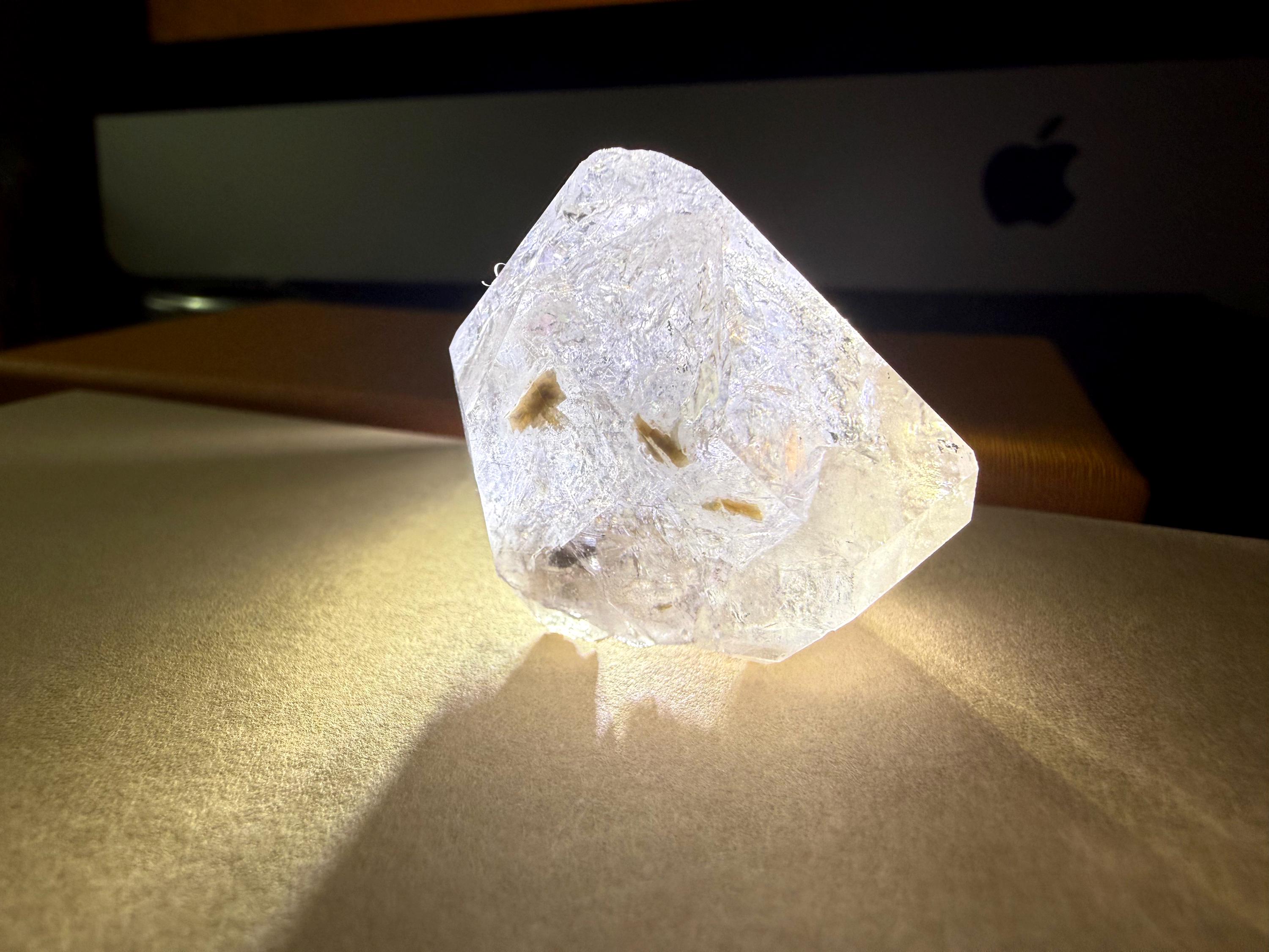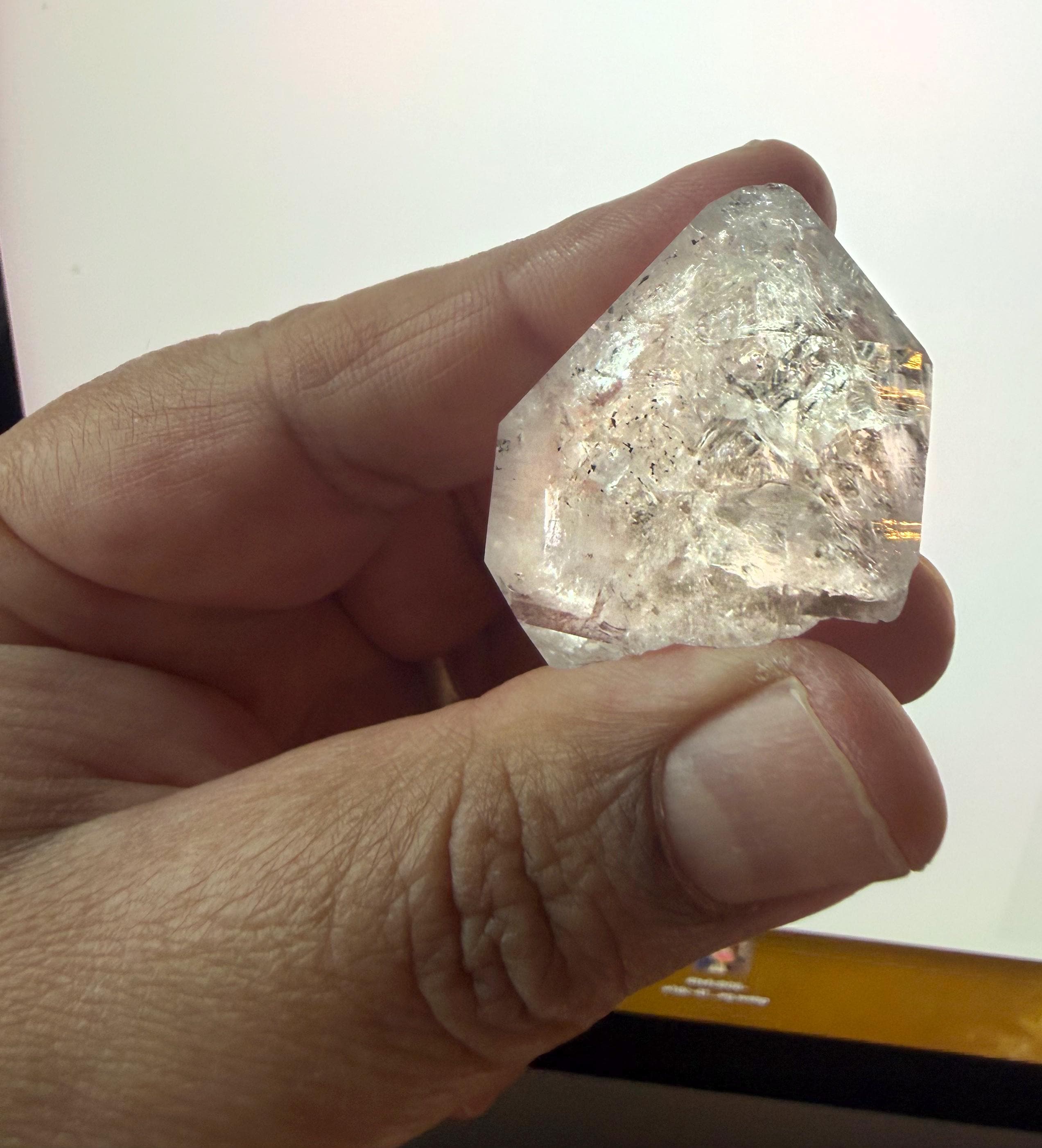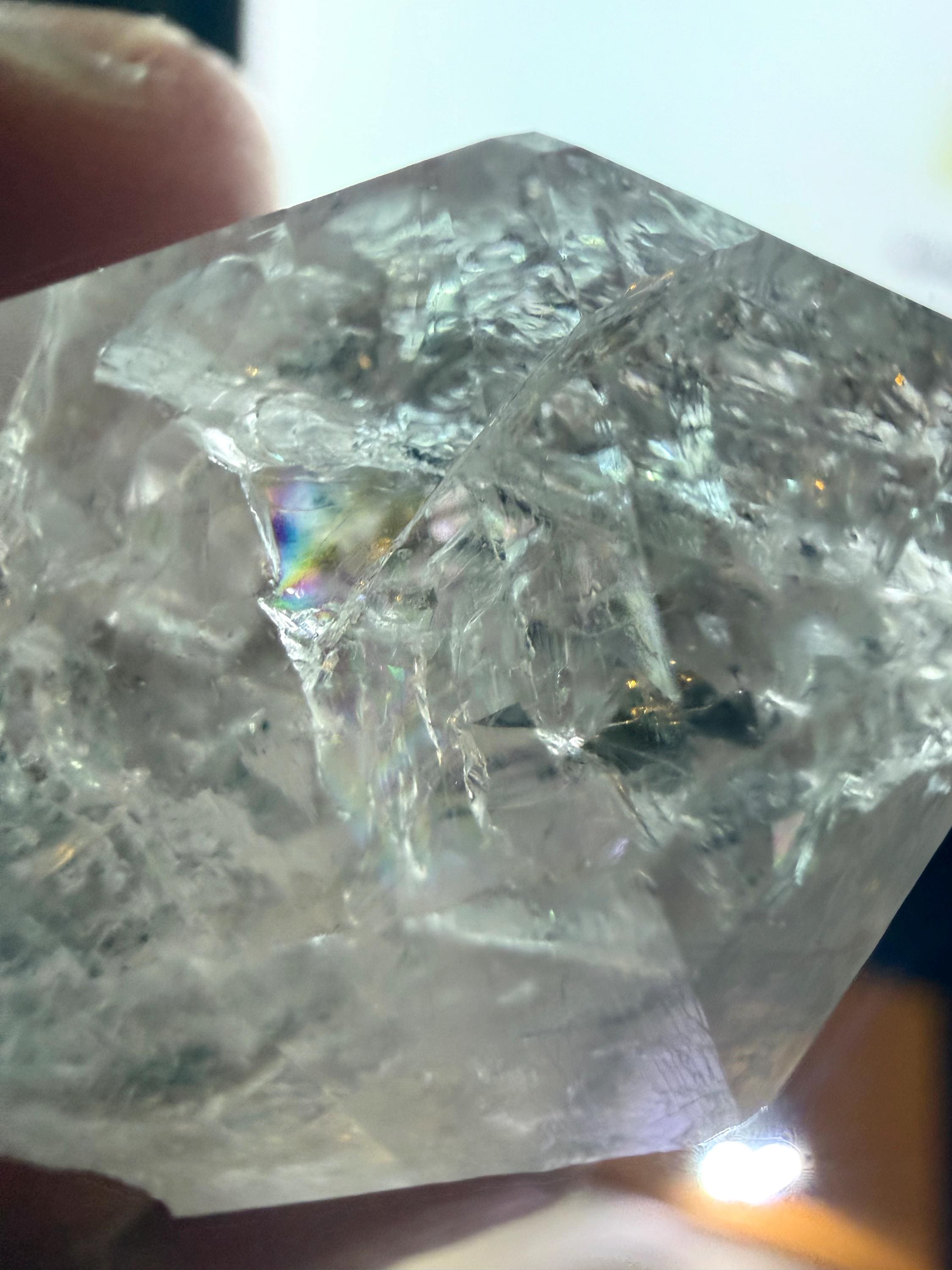 Unique, naturally faceted Herkimer Diamond (Quartz Crytstal) Great colorful refractions, A very clear icy&glassy feel. Very unique termination formation. Herkimer Diamonds formed in the earth nearly 500 million years ago in crystal pockets within ancient dolostone. Their unique conditions of formation—low-pressure hydrothermal fluids crystallizing slowly in hollow pockets—allowed for: