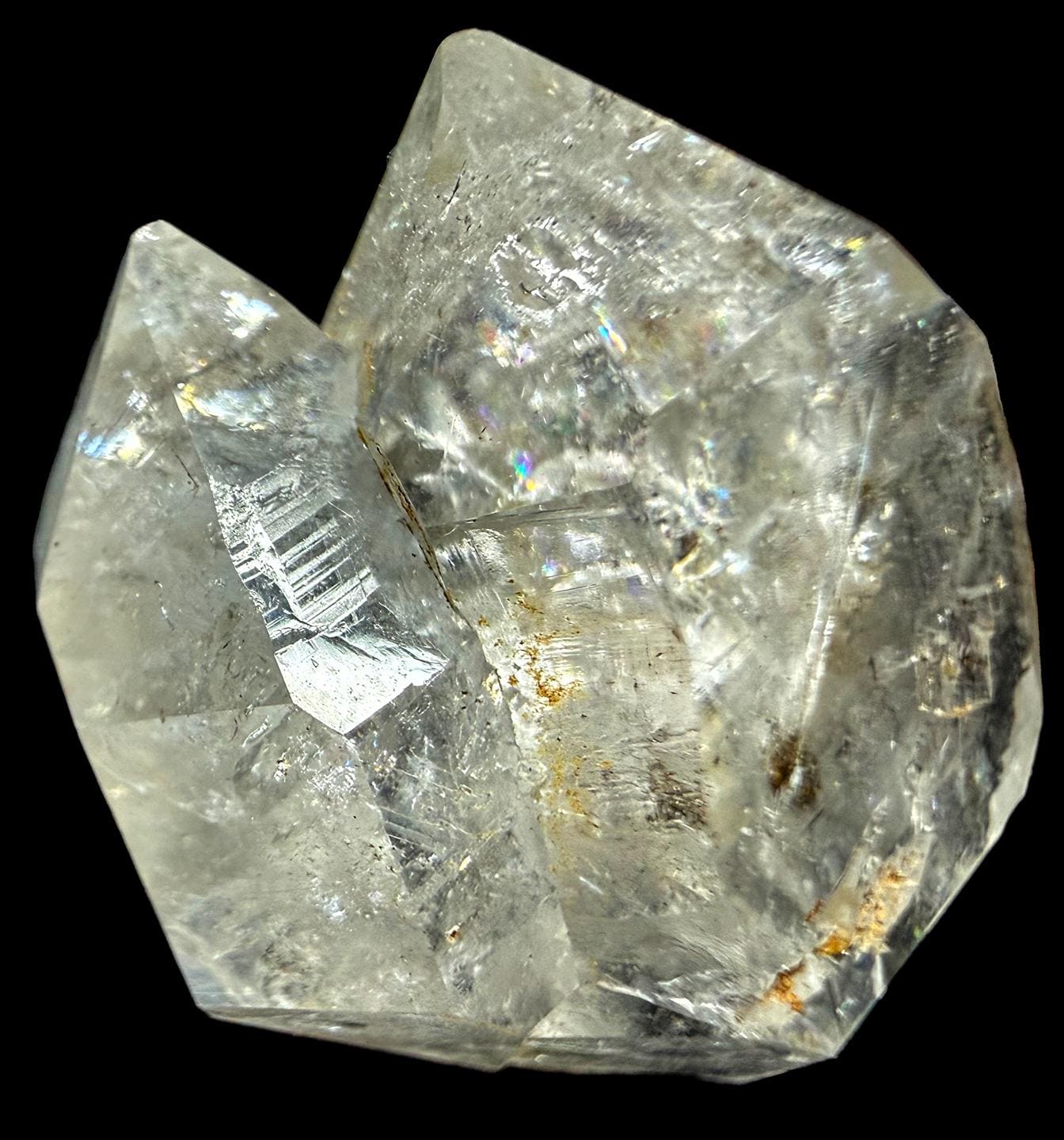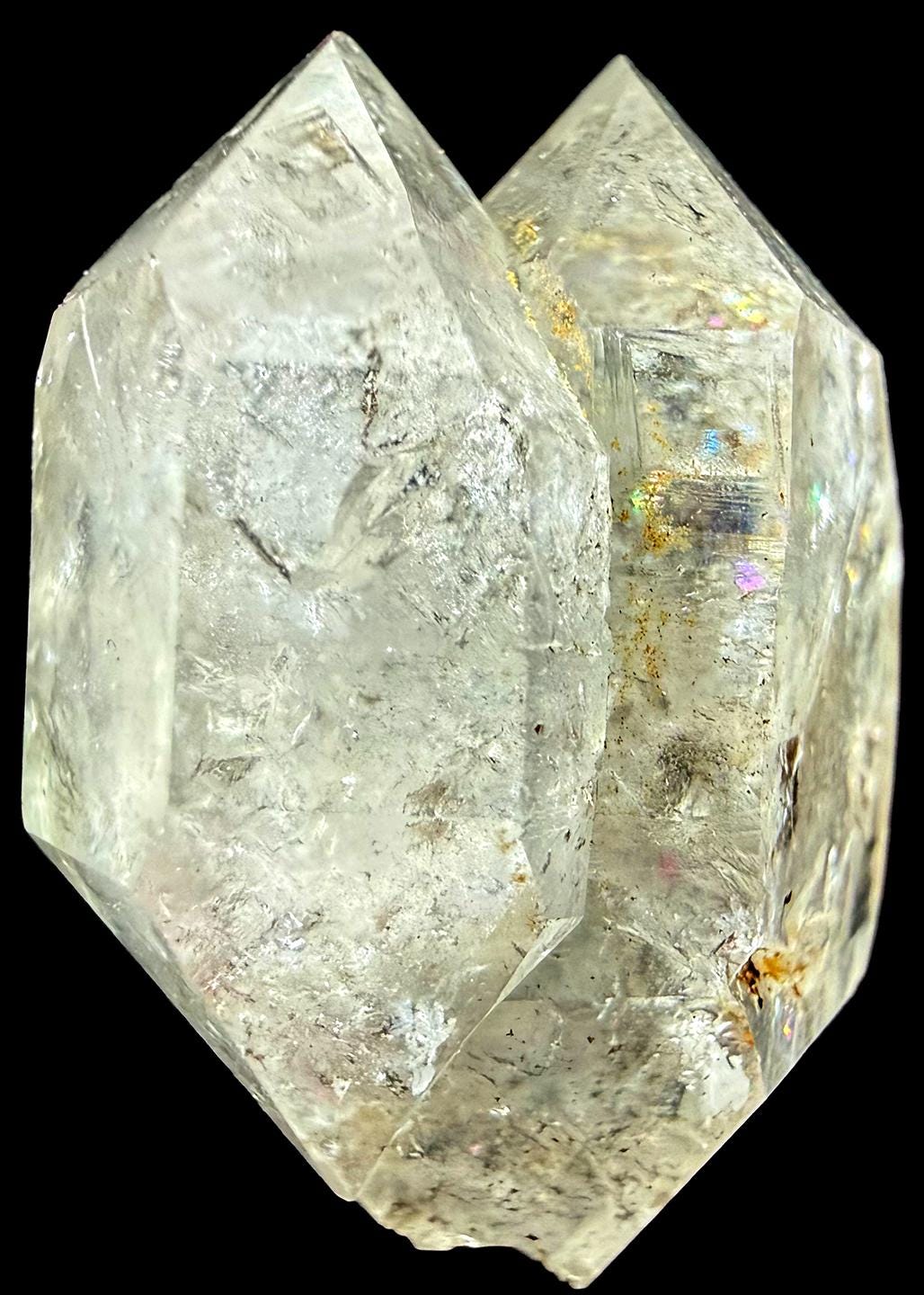 Unique, naturally faceted Herkimer Diamond (Quartz Crytstal) Great colorful refractions, golden and gray inclusions. Amazing texture: smooth icy facets and TRIPLE TERMINATED. Some pyrite and grey/black inclusions. The rainbows run amock!! Herkimer Diamonds formed in the earth nearly 500 million years ago in crystal pockets within ancient dolostone. Their unique conditions of formation—low-pressure hydrothermal fluids crystallizing slowly in hollow pockets—allowed for: